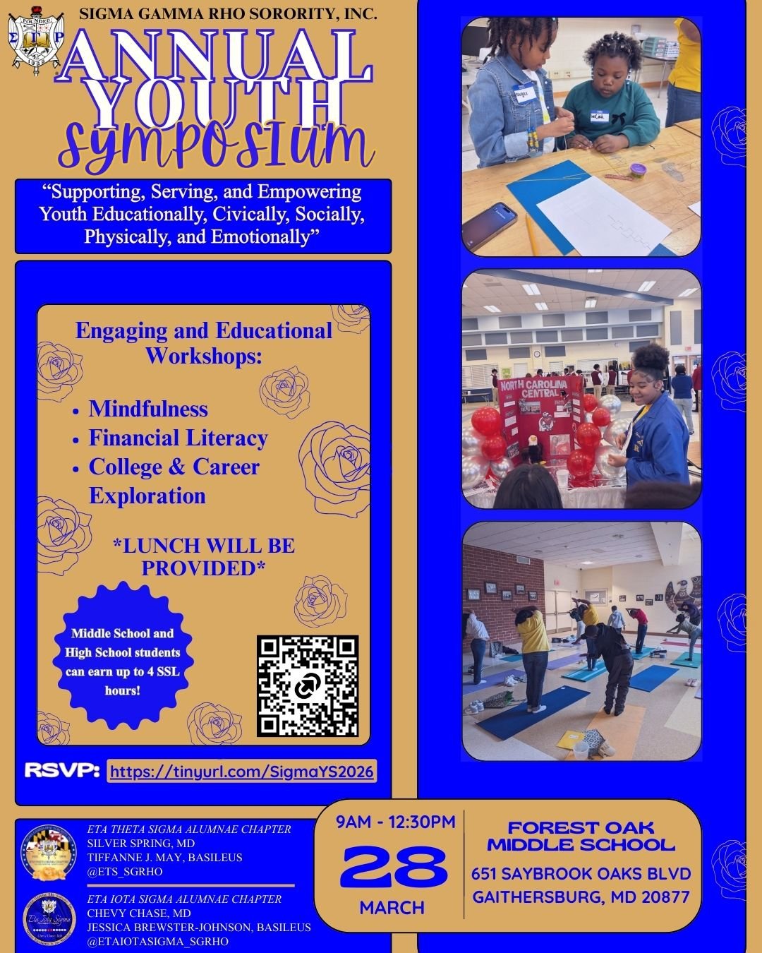 Attention students grades 3-12! You're Invited to the Annual Sigma Youth Symposium hosted by the Eta Theta Sigma and Eta Iota Sigma Chapters of Sigma Gamma Rho Sorority, Inc (Montgomery County, MD).