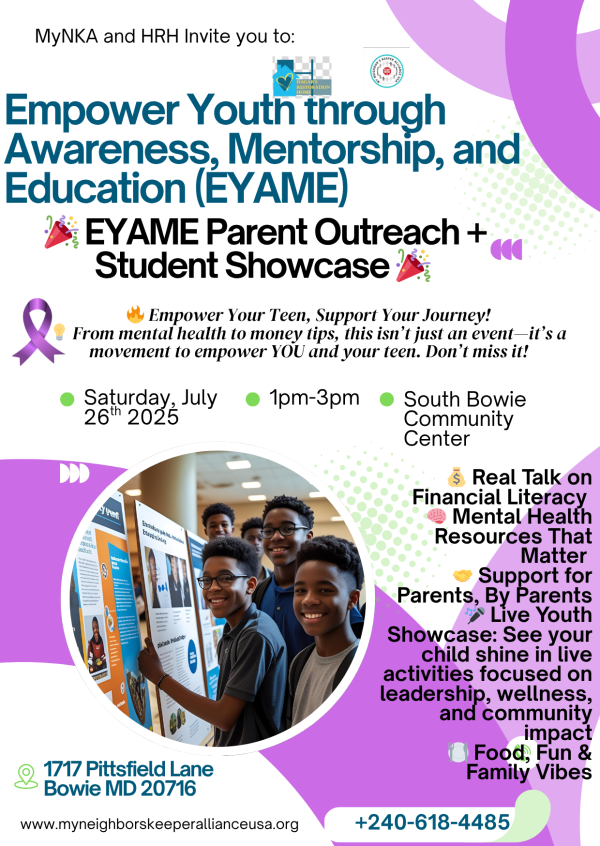 Be a part of something inspiring and impactful on Saturday, July 26th, 2025 (1:00–3:00 PM) at the South Bowie Community Center as we connect with families and celebrate youth voices!