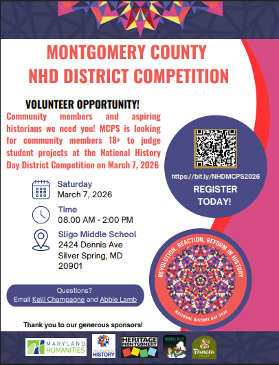 MCPS is looking for HS students 18+, to judge student projects at the National History Day County Competition on Saturday, March 7, 2026!
