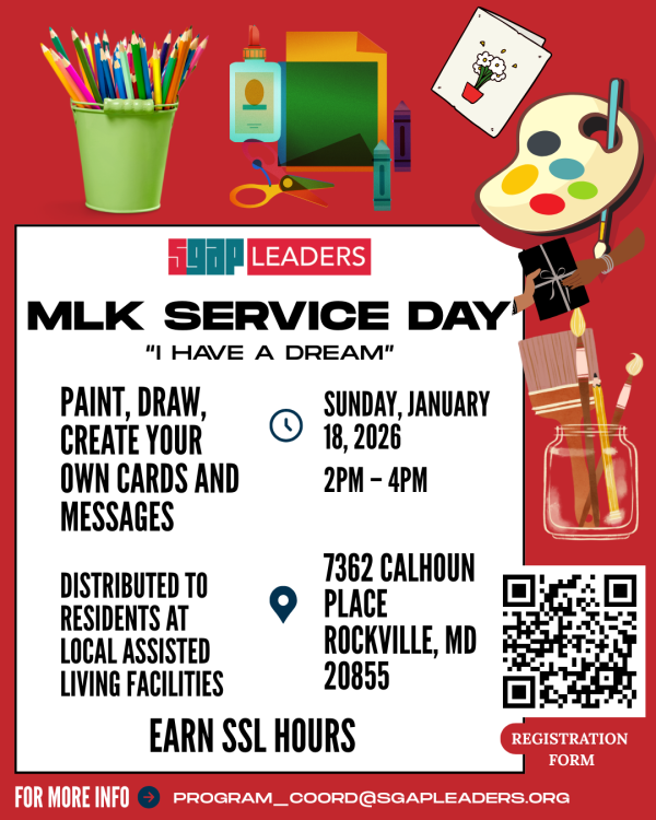Martin Luther King Jr. Day of Service is organized by SGAP Leaders to honor Dr. King’s legacy by turning his vision of equality and justice into action through community service. Engage in a meaningful community service by creating caring cards and messages for residents of local assisted living facilities.