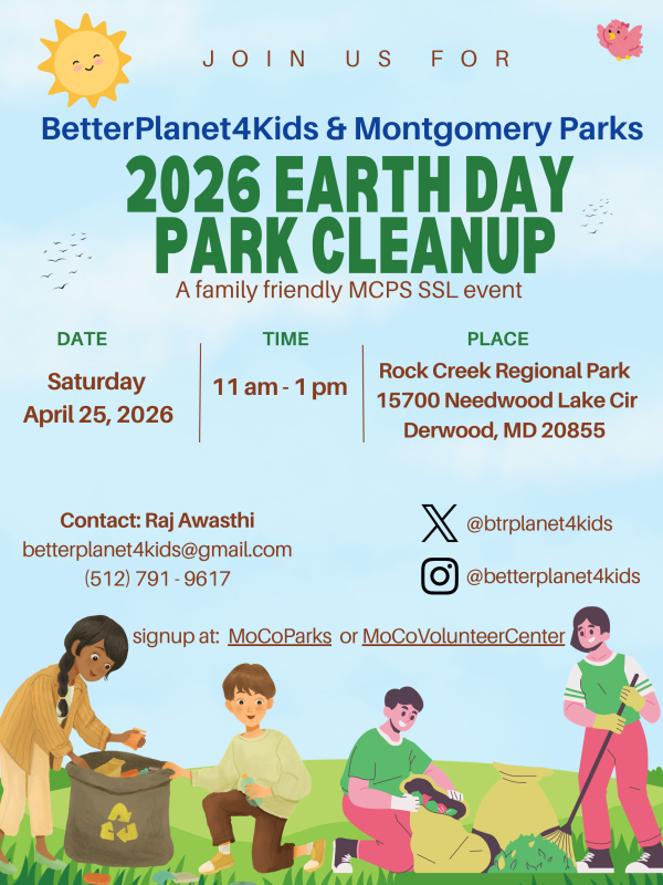 BetterPlanet4Kids 2026 Earth Day Park Clean up (A family friendly MCPS SSL Event)