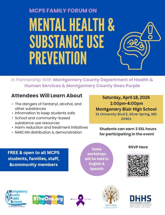 Montgomery County Public Schools (MCPS), in partnership with the Montgomery County Department of Health and Human Services and Montgomery Goes Purple, will host a family forum on mental health and substance use prevention to provide expertise and resources to students, staff, and families regarding the dangers of substance use.